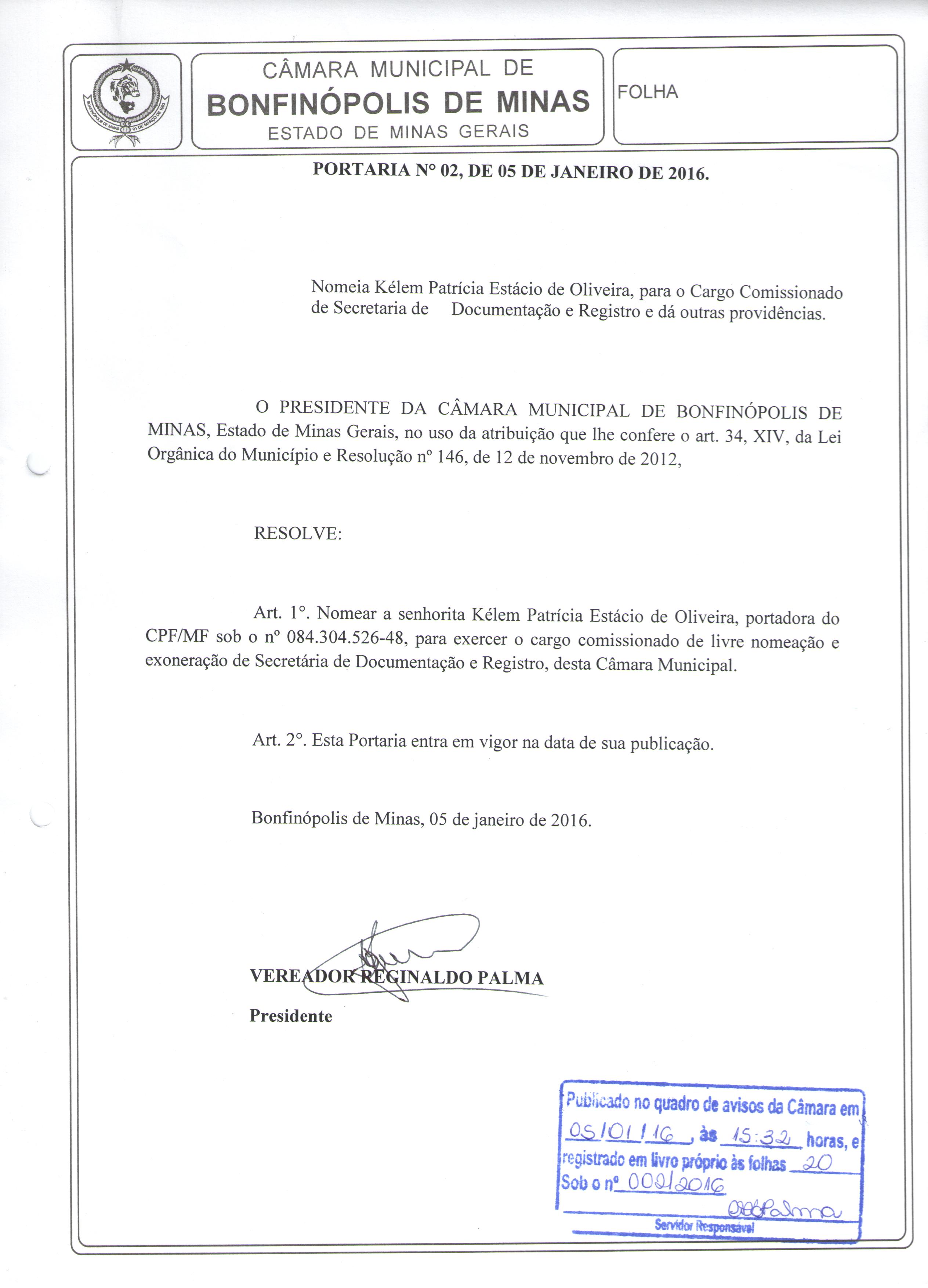 NOMEIA KÉLEM PATRÍCIA ESTÁCIO DE OLIVEIRA, PARA O CARGO COMISSIONADO DE SECRETÁRIA DE DOCUMENTAÇÃO E REGISTRO E DÁ OUTRAS PROVIDÊNCIAS.