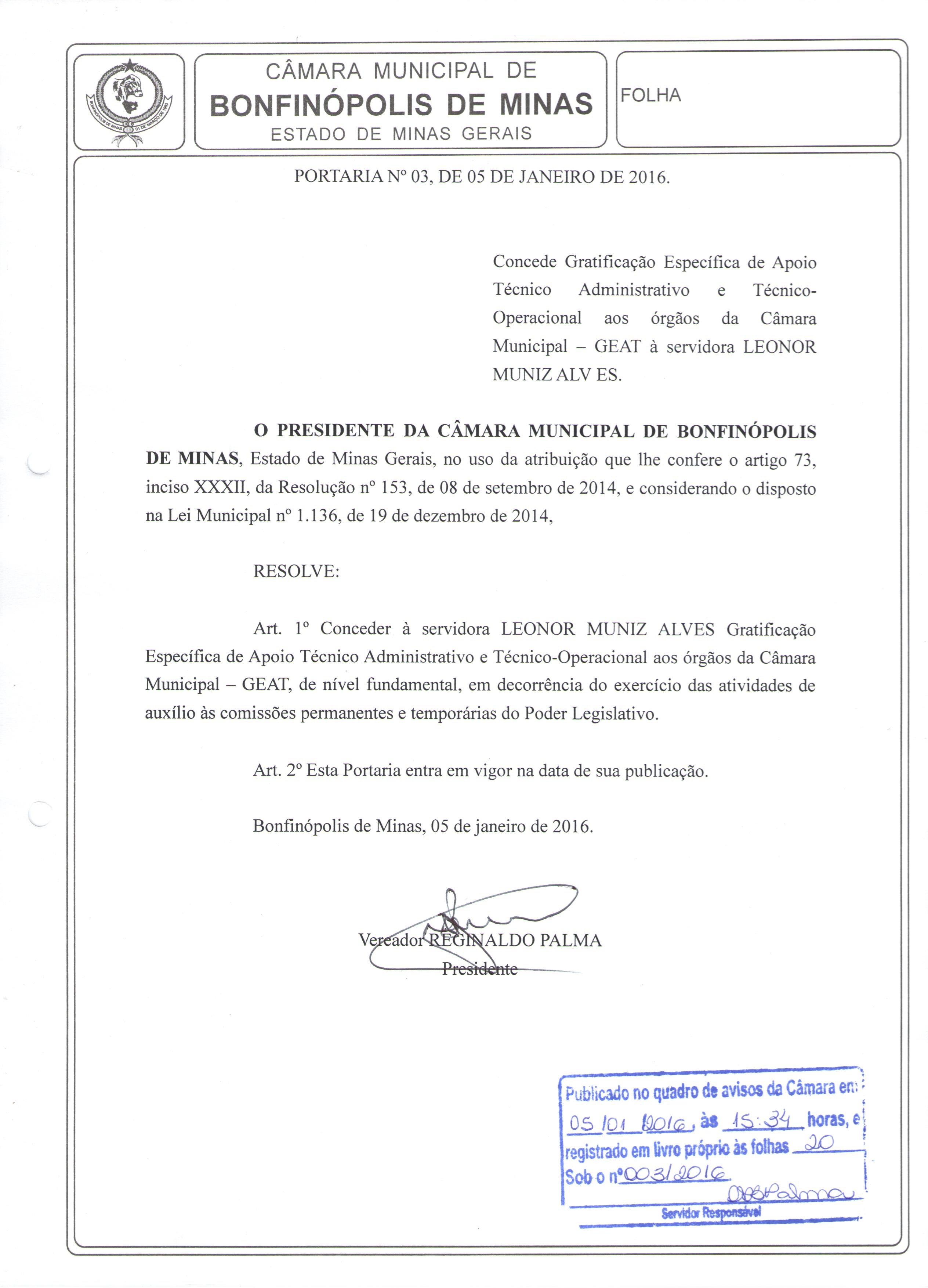 CONCEDE GRATIFICAÇÃO ESPECÍFICA DE APOIO TÉCNICO ADMINISTRATIVO E TÉCNICO OPERACIONAL AOS ÓRGÃOS DA CÂMARA MUNICIPAL - GEAT À SERVIDORA LEONOR MUNIZ ALVES.