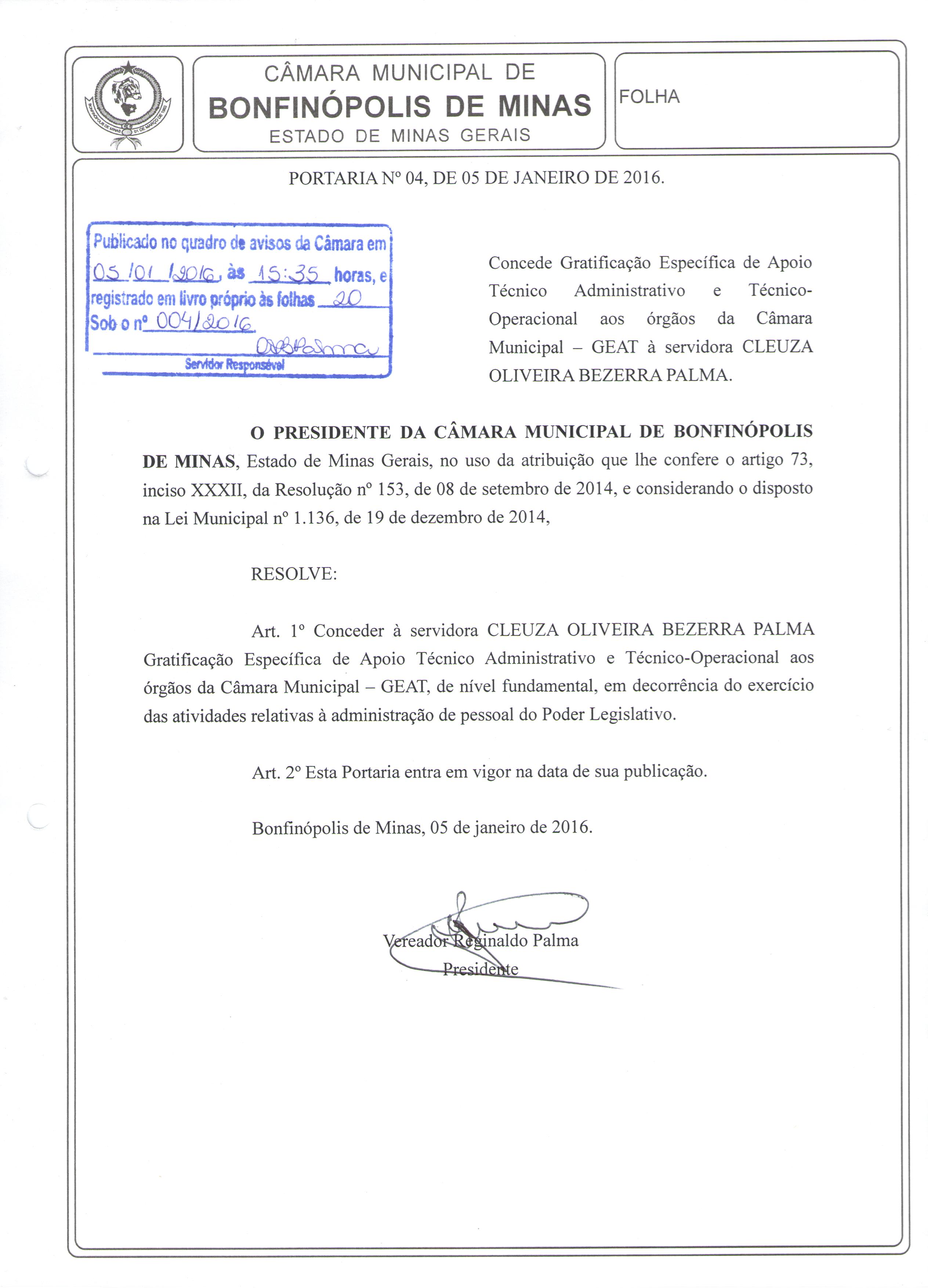 CONCEDE GRATIFICAÇÃO ESPECÍFICA DE APOIO TÉCNICO ADMINISTRATIVO E TÉCNICO OPERACIONAL AOS ÓRGÃOS DA CÂMARA MUNICIPAL - GEAT Á SERVIDORA CLEUZA OLIVEIRA BEZERRA PALMA.