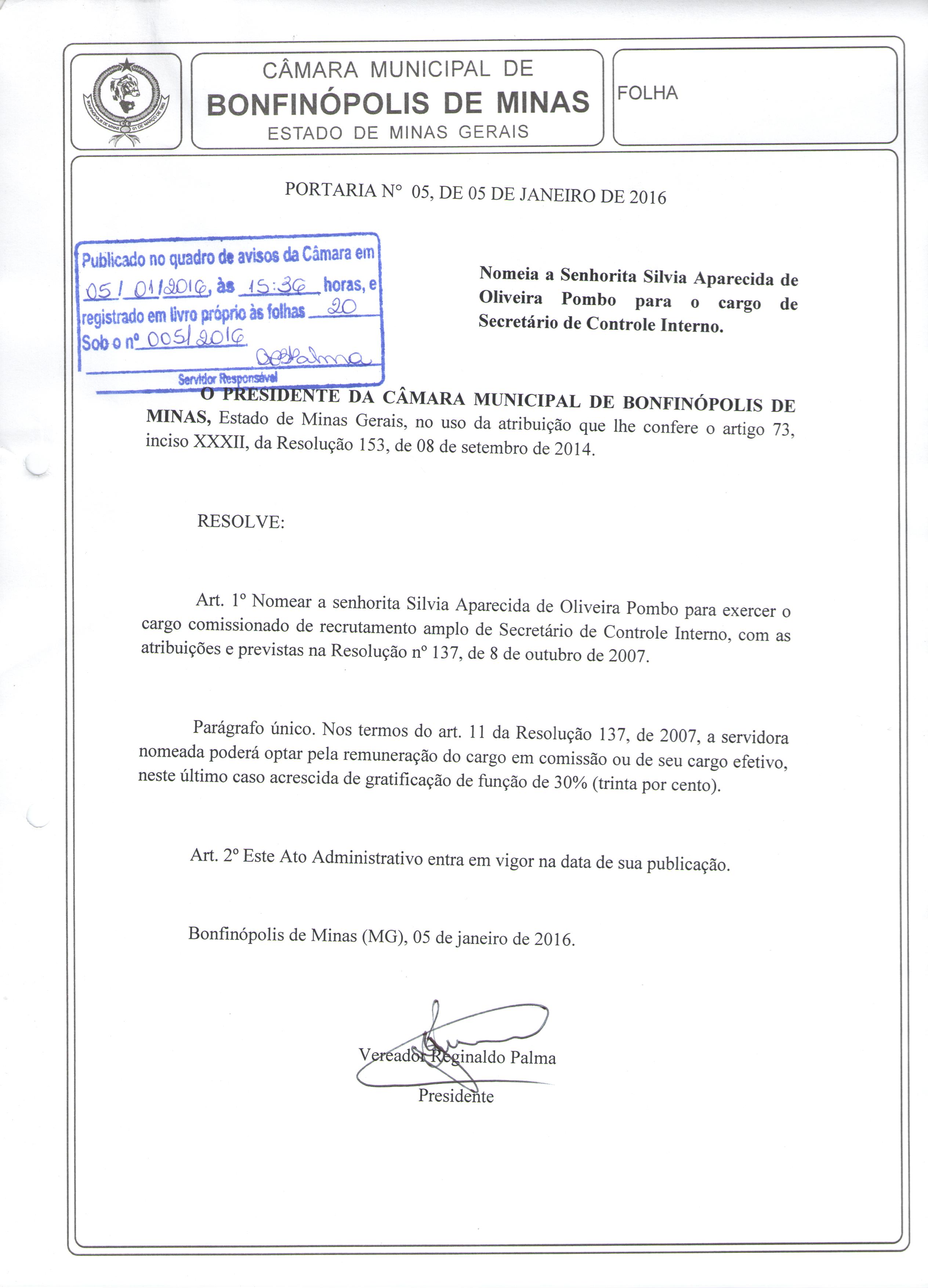 NOMEIA A SENHORITA SILVIA APARECIDA DE OLIVEIRA POMBO PARA O CARGO DE SECRETÁRIO DE CONTROLE INTERNO.