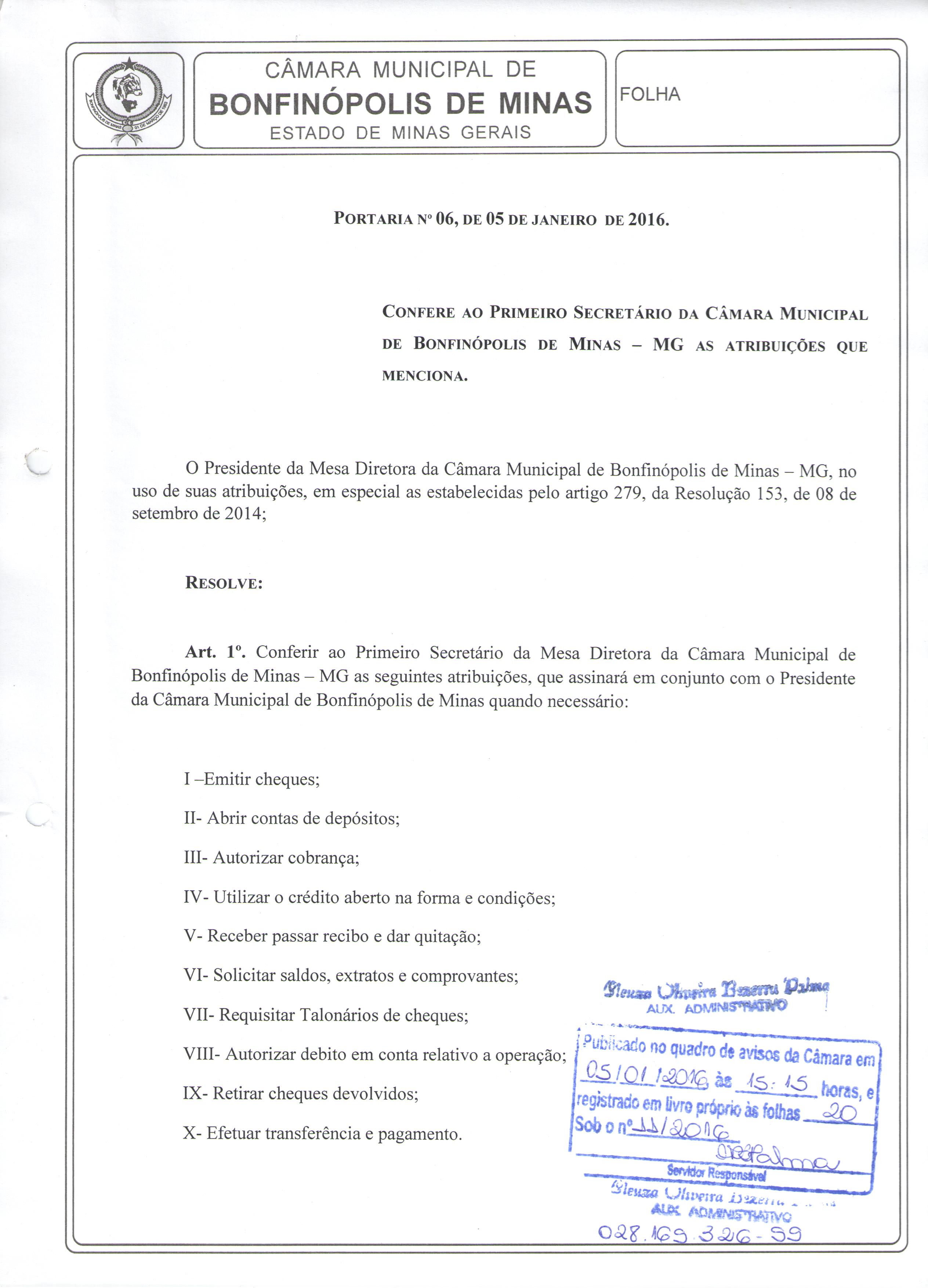 CONFERE AO PRIMEIRO SECRETÁRIO DA CÂMARA MUNICIPAL DE BONFINÓPOLIS DE MINAS - MG AS ATRIBUIÇÕES QUE MENCIONA.