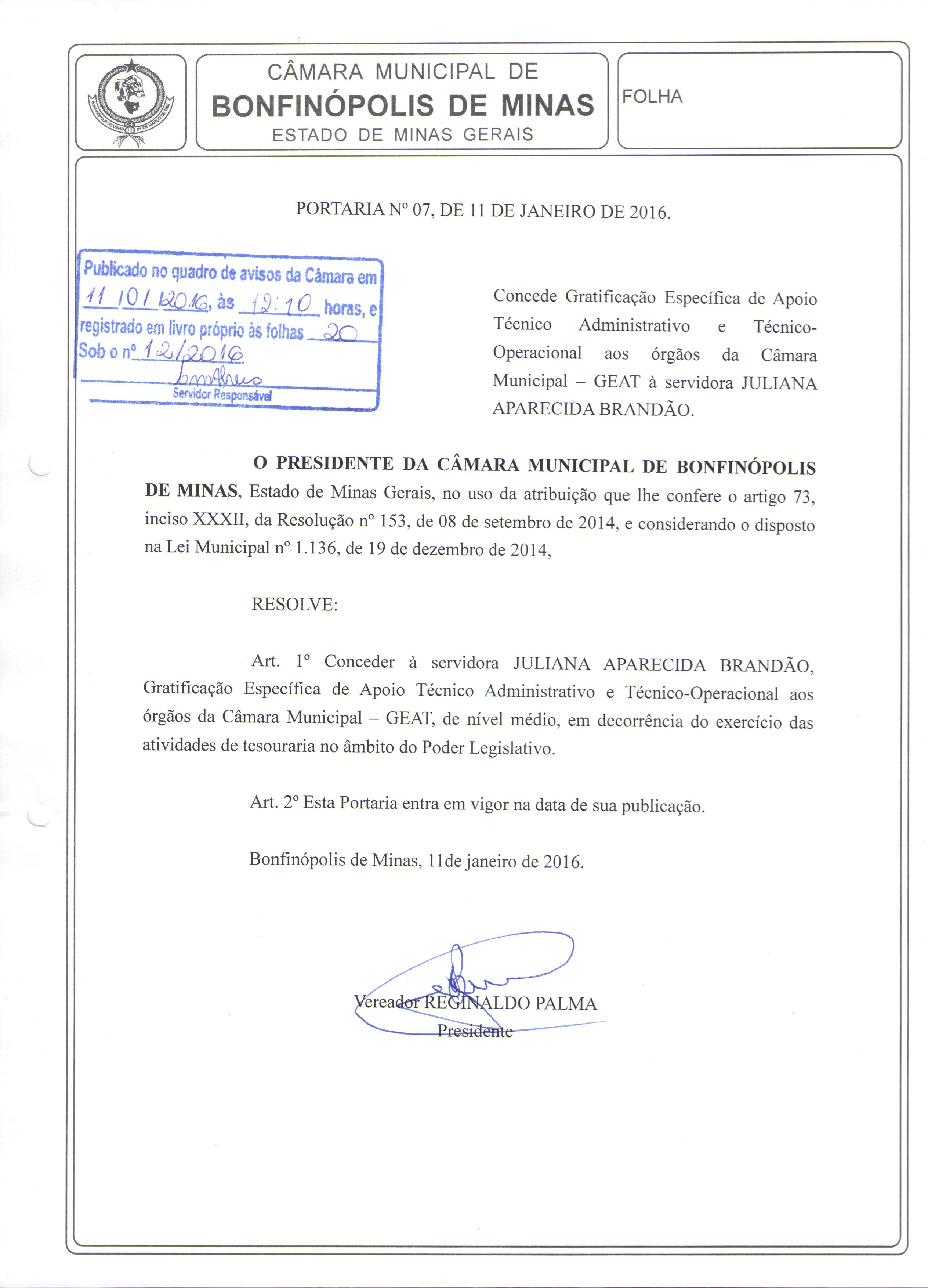 CONCEDE GRATIFICAÇÃO ESPECÍFICA DE APOIO TÉCNICO ADMINISTRATIVO E TÉCNICO OPERACIONAL AOS ÓRGÃOS DA CÂMARA MUNICIPAL - GEAT À SERVIDORA JULIANA APARECIDA BRANDÃO.