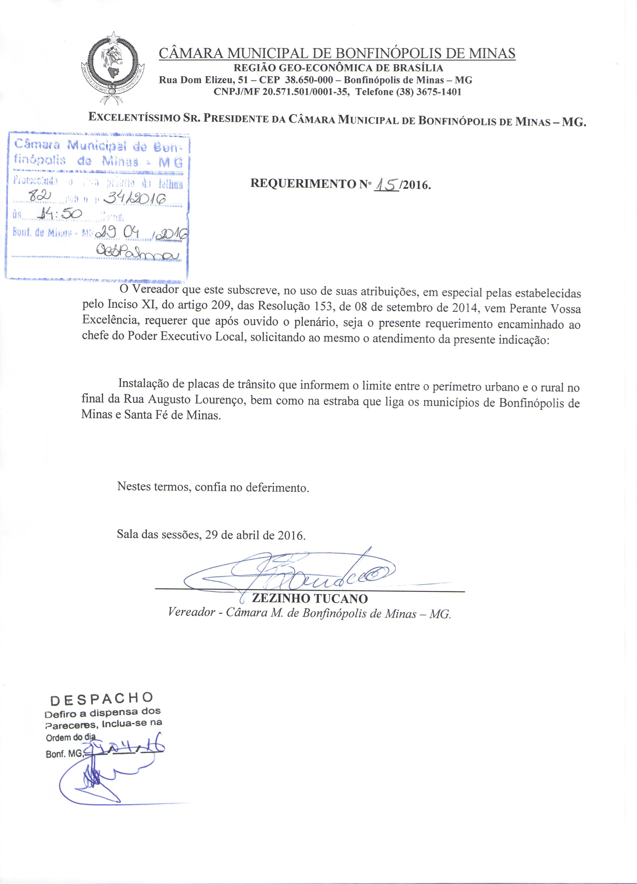 OS MEMBROS DA COMISSÃO DE ADMINISTRAÇÃO PÚBLICA DA CÂMARA MUNICIPAL DE BONFINÓPOLIS DE MINAS – MG, NO USO DE SUAS ATRIBUIÇÕES, EM ESPECIAL PELAS ESTABELECIDAS PELO INCISO XVI, DO ARTIGO 91, DA RESOLUÇÃO 153, DE 08 DE SETEMBRO DE 2014, VEM PERANTE VOSSA EXCELÊNCIA, REQUERER QUE APÓS OUVIDO O PLENÁRIO, SEJA O PRESENTE REQUERIMENTO ENCAMINHADO AO CHEFE DO PODER EXECUTIVO LOCAL, SOLICITANDO AO MESMO AS SEGUINTES INFORMAÇÕES: INFORMAÇÕES SOBRE A EXATA LOCALIZAÇÃO DOS LOCAIS ONDE OS MATA-BURROS ENVIADOS AO MUNICÍPIO PELO GOVERNO DO ESTADO, POR INTERMÉDIO DA SECRETARIA DE ESTADO DE TRANSPORTE E OBRAS PÚBLICAS SETOP, FORAM INSTALADOS. SOLICITAMOS AINDA, QUE CASO OS MESMOS NÃO TENHAM SIDO INSTALADOS QUE INFORME O MOTIVO DA NÃO INSTALAÇÃO.
