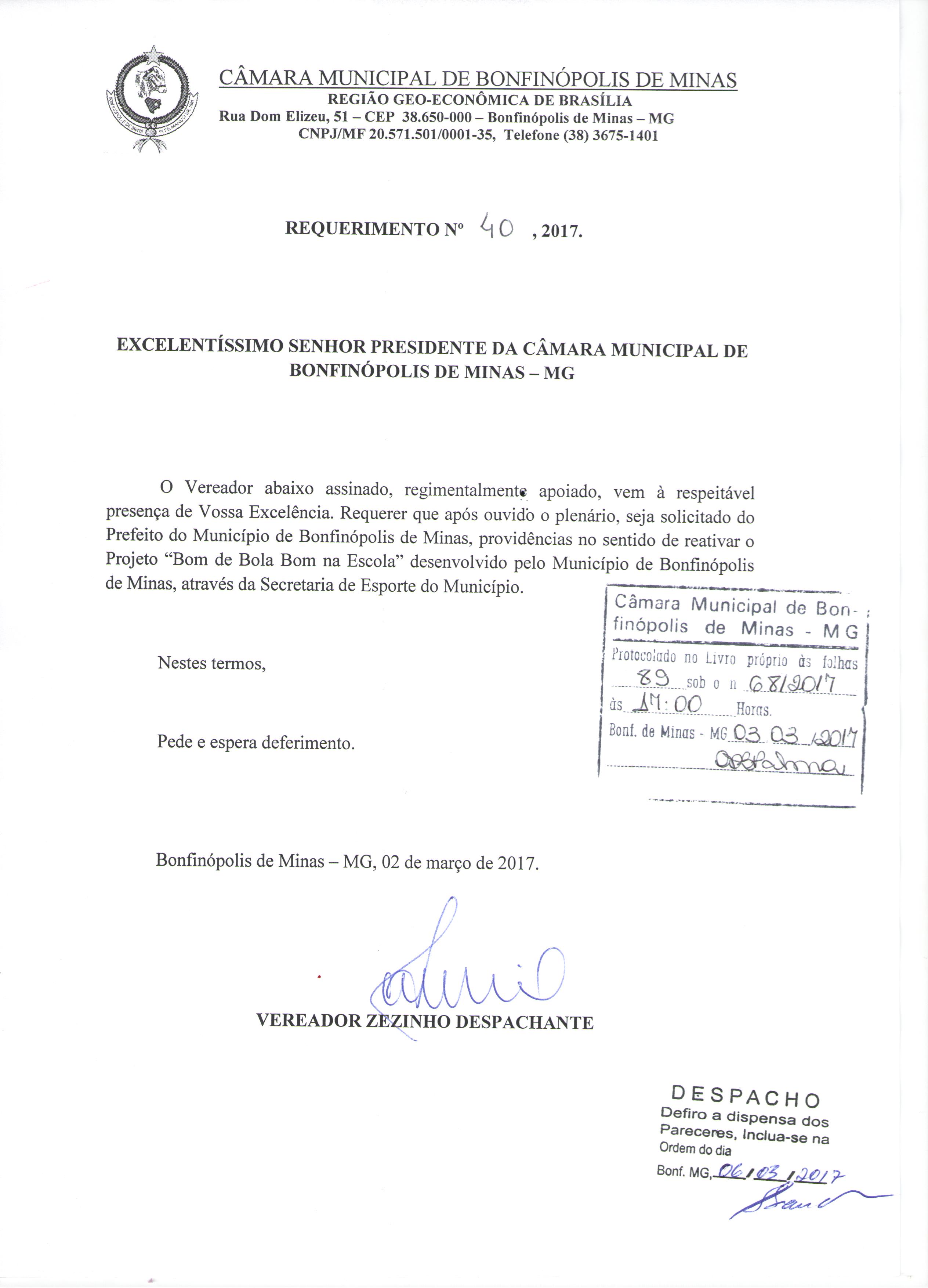 Ementa: O VEREADOR ABAIXO ASSINADO, REGIMENTALMENTE APOIADO, VEM À RESPEITÁVEL PRESENÇA DDE VOSSA EXCELÊNCIA REQUERER QUE APÓS OUVIDO O PLENÁRIO, SEJA SOLICITADO DO PREFEITO DO MUNICÍPIO DE BONFINÓPOLIS DE MINAS,PROVIDÊNCIAS NO SENTIDO DE REATIVAR O PROJETO "BOM DE BOLA BOM NA ESCOLA" DESENVOLVIDO PELO MUNICÍPIO DE BONFINÓPOLIS DE MINAS, ATRAVÉS DA SECRETARIA DE ESPORTE DO MUNICÍPIO.