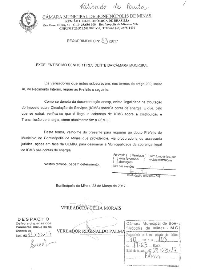 DESTA FORMA, VALHO-ME DO PRESENTE PARA REQUERER AO DOUTO PREFEITO DO MUNICÍPIO DE BONFINÓPOLIS DE MINAS QUE PROVIDENCIE, VIA PROCURADORIA OU ASSESSORIA JURÍDICA, AÇÕES EM FACE DA CEMIG, PARA DESONERAR A MUNICIPALIDADE DA COBRANÇA ILEGAL DE ICMS NAS CONTAS DE ENERGIA.