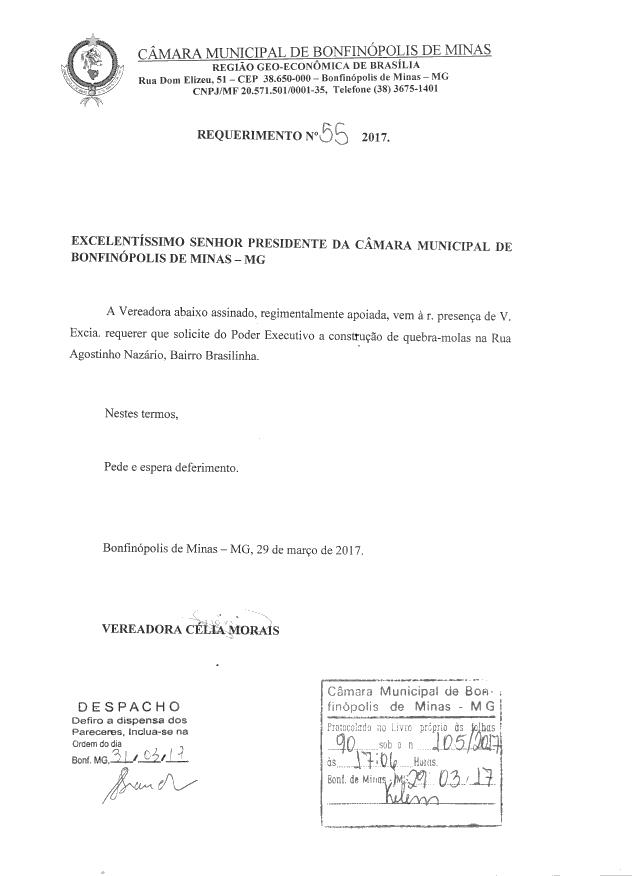Ementa: A VEREADORA ABAIXO ASSINADO, REGIMENTALMENTE APOIADA, VEM À R. PRESENÇA DE V. EXCIA. REQUERER QUE SOLICITE DO PODER EXECUTIVO A CONSTRUÇÃO DE QUEBRA-MOLAS NA RUA AGOSTINHO NAZÁRIO, BAIRRO BRASILINHA.