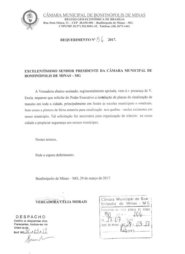 Ementa: O VEREADOR ABAIXO ASSINADO, REGIMENTALMENTE APOIADO, VEM À RESPEITÁVEL PRESENÇA DE VOSSA EXCELÊNCIA REQUERER QUE SOLICITE DO PREFEITO DO MUNICÍPIO DE BONFINÓPOLIS DE MINAS, PROVIDÊNCIAS NO SENTIDO DE CONSTRUIR QUEBRA-MOLAS NA RUA PAULO LÚCIO DE MENEZES. UMA VEZ QUE OS VEÍCULOS NO MENCIONADO LOCAL EM ALTA VELOCIDADE, COLOCANDO VIDAS EM RISCO.