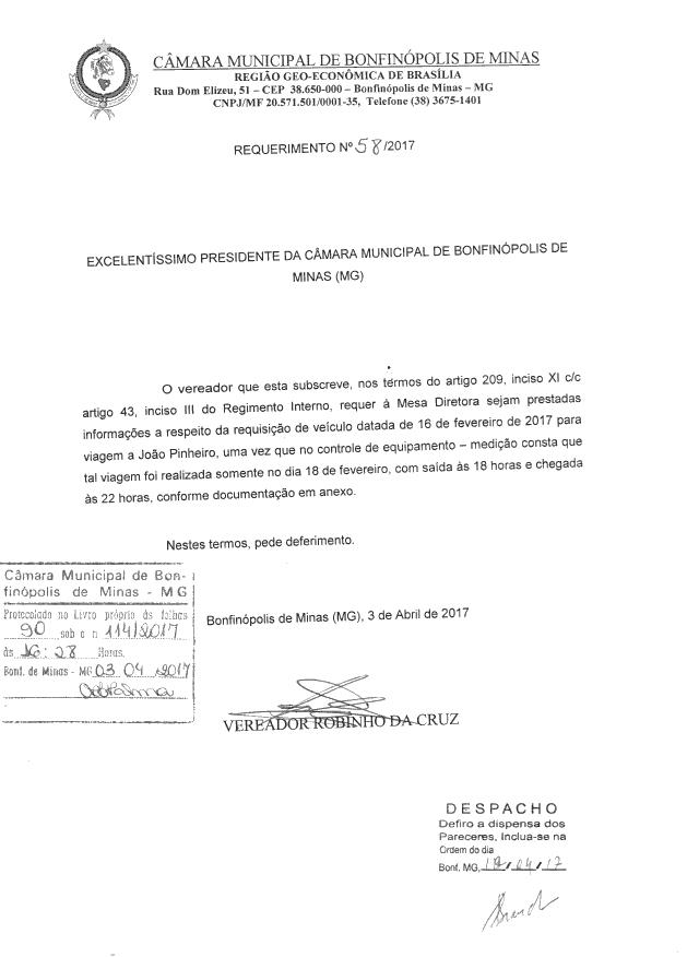 Ementa: O VEREADOR QUE ESTA SUBSCREVE, NOS TERMOS DO ARTIGO 209, INCISO XI C/C ARTIGO 43, INCISO III DO REGIMENTO INTERNO, REQUER À MESA DIRETORA SEJAM PRESTADAS INFORMAÇÕES A RESPEITO DA REQUISIÇÃO DE VEÍCULO DATADA DE 16 DE FEVEREIRO DE 2017 PARA VIAGEM A JOÃO PINHEIRO, UMA VEZ QUE NO CONTROLE DE EQUIPAMENTO – MEDIÇÃO CONSTA QUE TAL VIAGEM FOI REALIZADA SOMENTE NO DIA 18 DE FEVEREIRO, COM SAÍDA ÀS 18 HORAS E CHEGADA ÀS 22 HORAS, CONFORME DOCUMENTAÇÃO EM ANEXO.