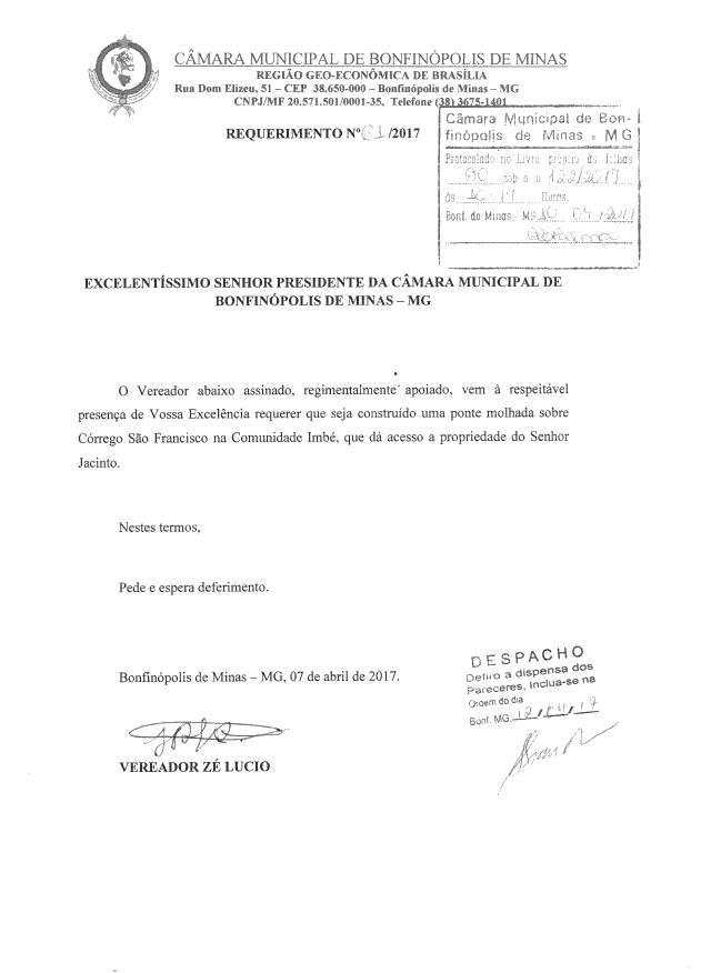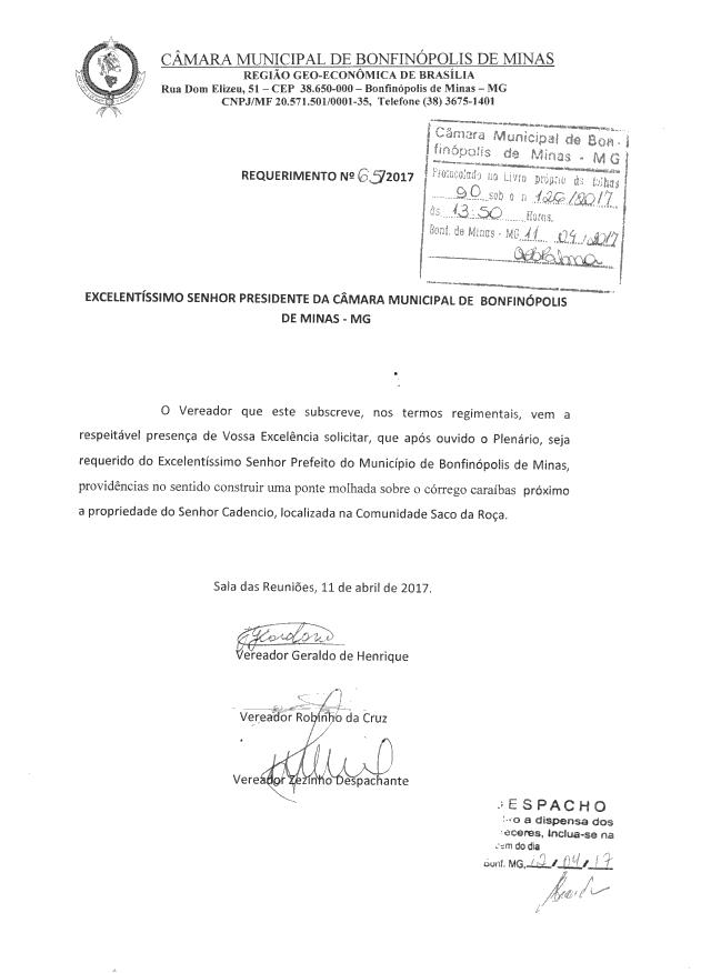Ementa: O VEREADOR QUE ESTE SUBSCREVE, NOS TERMOS REGIMENTAIS, VEM A RESPEITÁVEL PRESENÇA DE VOSSA EXCELÊNCIA SOLICITAR, QUE APÓS OUVIDO O PLENÁRIO, SEJA REQUERIDO DO EXCELENTÍSSIMO SENHOR PREFEITO DO MUNICÍPIO DE BONFINÓPOLIS DE MINAS, PROVIDÊNCIAS NO SENTIDO CONSTRUIR UMA PONTE MOLHADA SOBRE O CÓRREGO CARAÍBAS PRÓXIMO A PROPRIEDADE DO SENHOR CADENCIO, LOCALIZADA NA COMUNIDADE SACO DA ROÇA.