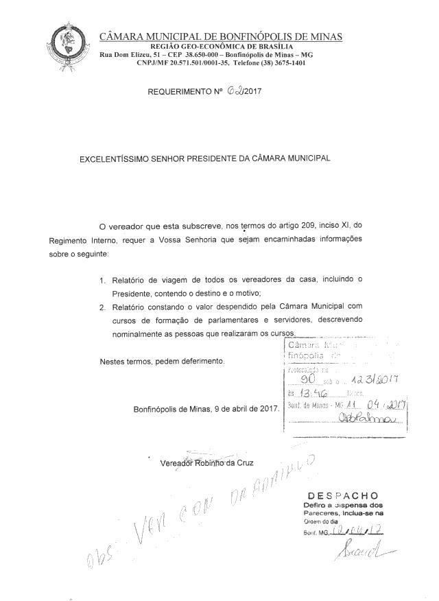 Ementa: OS VEREADORES QUE ESTE SUBSCREVEM, NOS TERMOS DO ARTIGO 209, INCISO XI, DO REGIMENTO INTERNO, REQUEREM AO PREFEITO QUE SEJAM ENCAMINHADAS A ESTA CASA CÓPIAS INTEGRAIS DE TODOS OS PROCESSOS LICITATÓRIO E NOTAS DE EMPRENHO REFERENTES A SERVIÇOS PRESTADOS NO PERÍODO DE JANEIRO DE 2016 A ABRIL DE 2017, PELA PESSOA JURÍDICA RAFAEL DOS SANTOS, CNPJ 24.349.905/0001-30.