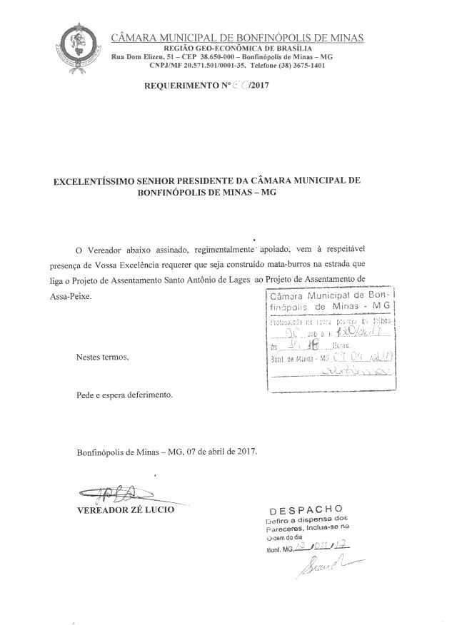 Ementa: O VEREADOR ABAIXO ASSINADO, REGIMENTALMENTE APOIADO, VEM À RESPEITÁVEL PRESENÇA DE VOSSA EXCELÊNCIA, REQUERER QUE APÓS OUVIDO O PLENÁRIO, SEJA SOLICITADO DO PREFEITO DO MUNICÍPIO DE BONFINÓPOLIS DE MINAS, PROVIDÊNCIAS NO SENTIDO DE CONSTRUIR UM MATA-BURRO NA ENTRADA DA ASSOCIAÇÃO RIACHO DA LAGOA, ONDE BENEFICIARÁ.