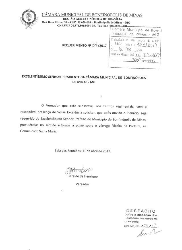 Ementa: O VEREADOR QUE ESTE SUBSCREVE, NOS TERMOS REGIMENTAIS, VEM A RESPEITÁVEL PRESENÇA DE VOSSA EXCELÊNCIA SOLICITAR, QUE APÓS OUVIDO O PLENÁRIO, SEJA REQUERIDO DO EXCELENTÍSSIMO SENHOR PREFEITO DO MUNICÍPIO DE BONFINÓPOLIS DE MINAS, PROVIDÊNCIAS NO SENTIDO REFORMAR A PONTE SOBRE O CÓRREGO RIACHO DA PORTEIRA, NA COMUNIDADE SANTA MARIA.