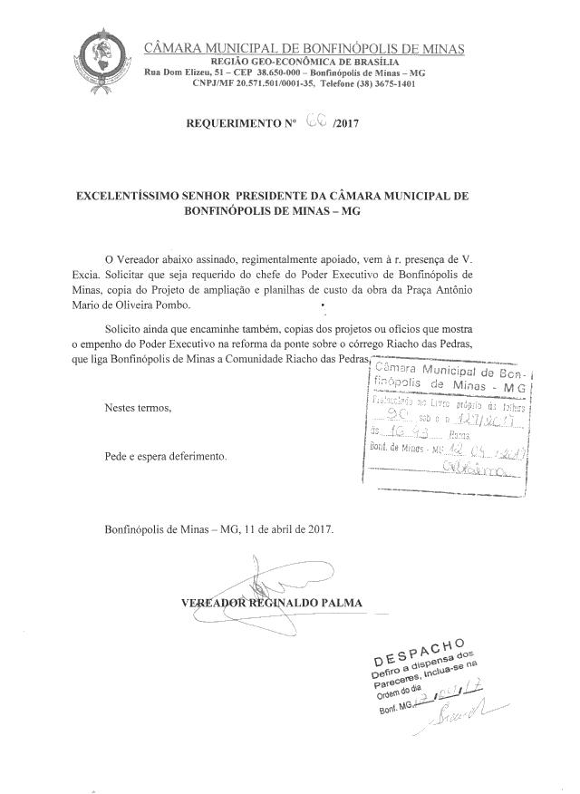 Ementa: O VEREADOR ABAIXO ASSINADO, REGIMENTALMENTE APOIADO, VEM À R. PRESENÇA DE V. EXCIA. SOLICITAR QUE SEJA REQUERIDO DO CHEFE DO PODER EXECUTIVO DE BONFINÓPOLIS DE MINAS, COPIA DO PROJETO DE AMPLIAÇÃO E PLANILHAS DE CUSTO DA OBRA DA PRAÇA ANTÔNIO MARIO DE OLIVEIRA POMBO.
