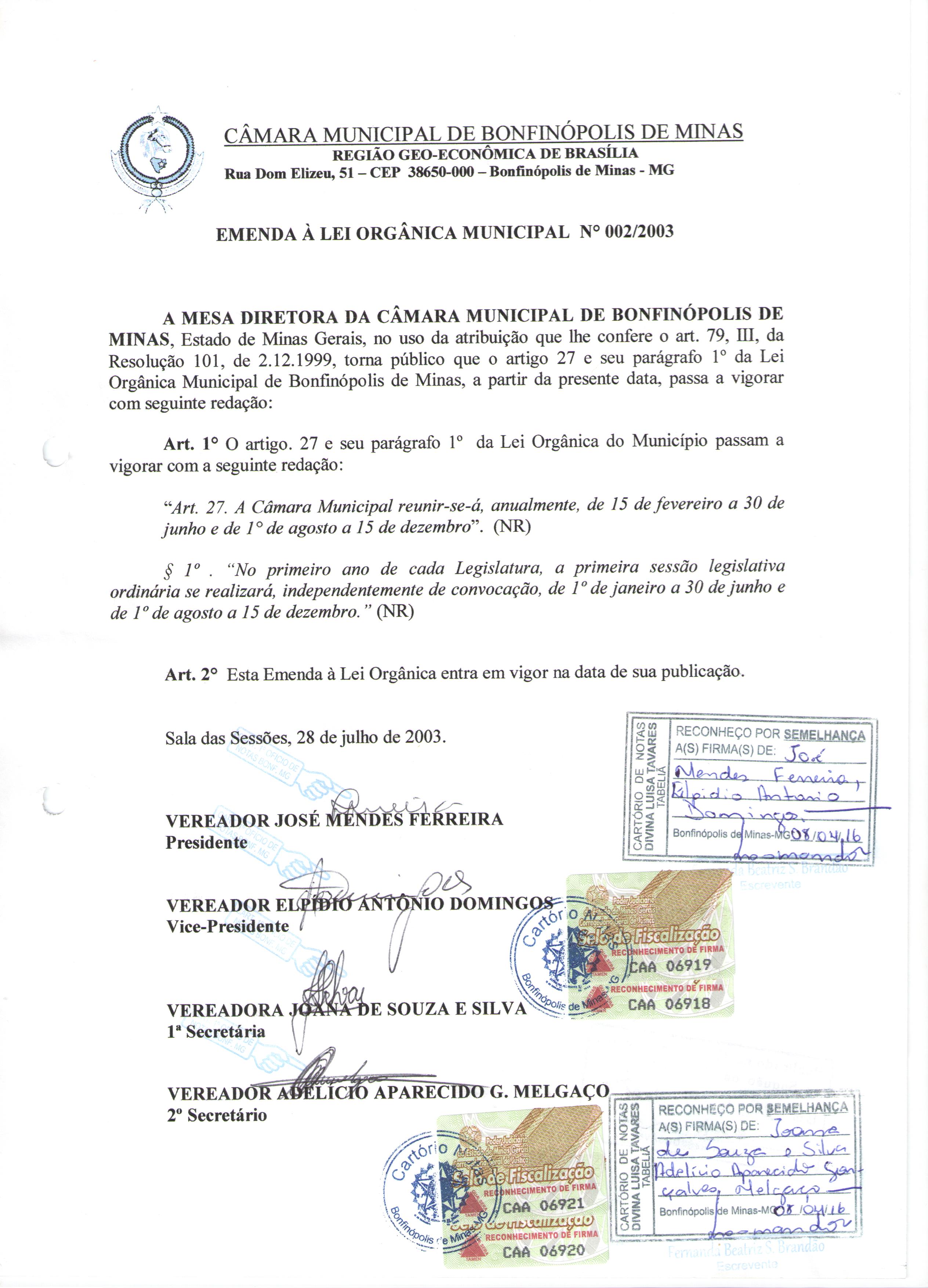 Emenda a Lei Orgânica do Município nº 2, de 28 de julho de 2003
