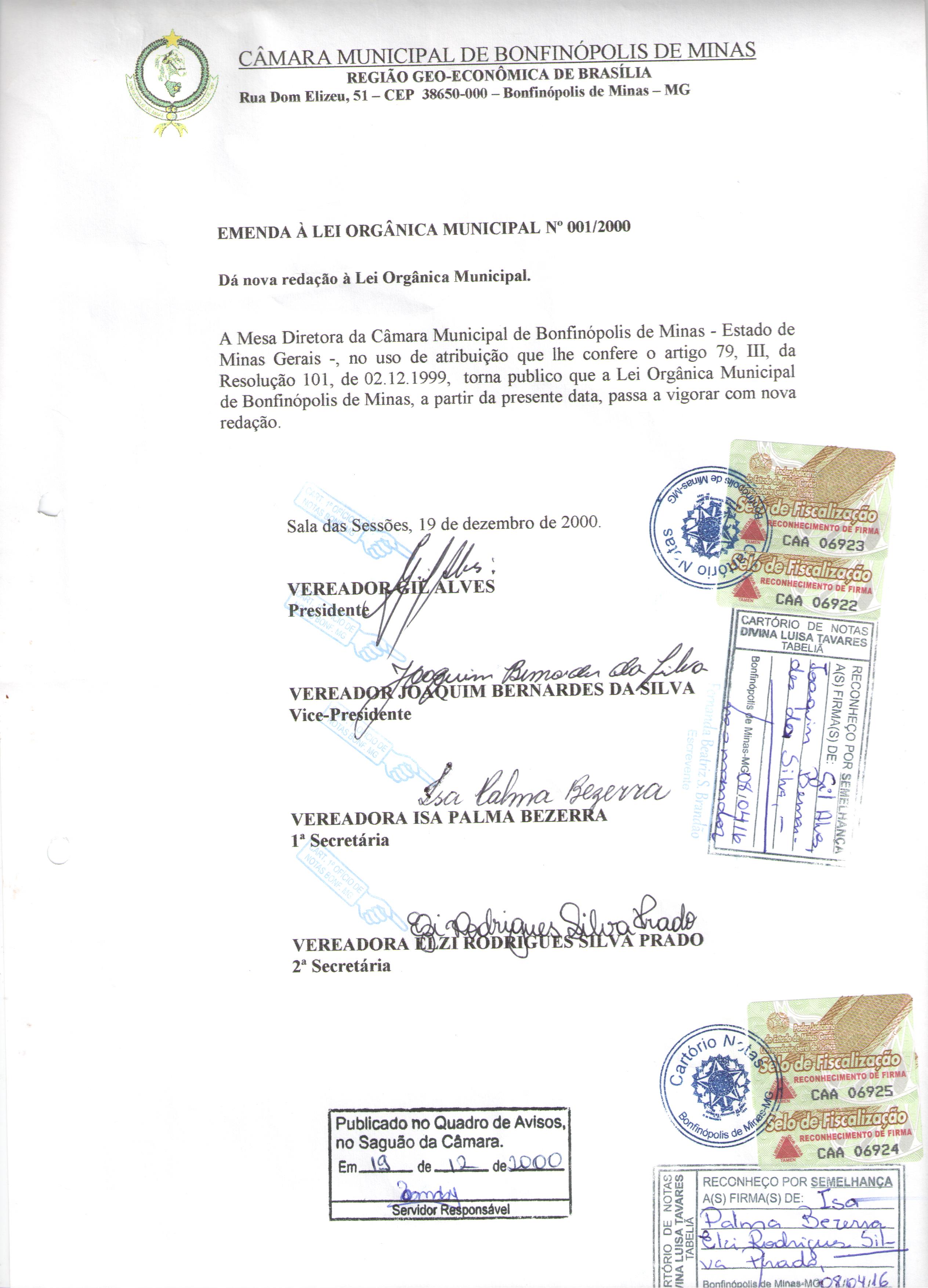 Emenda a Lei Orgânica do Município nº 1, de 19 de dezembro de 2000