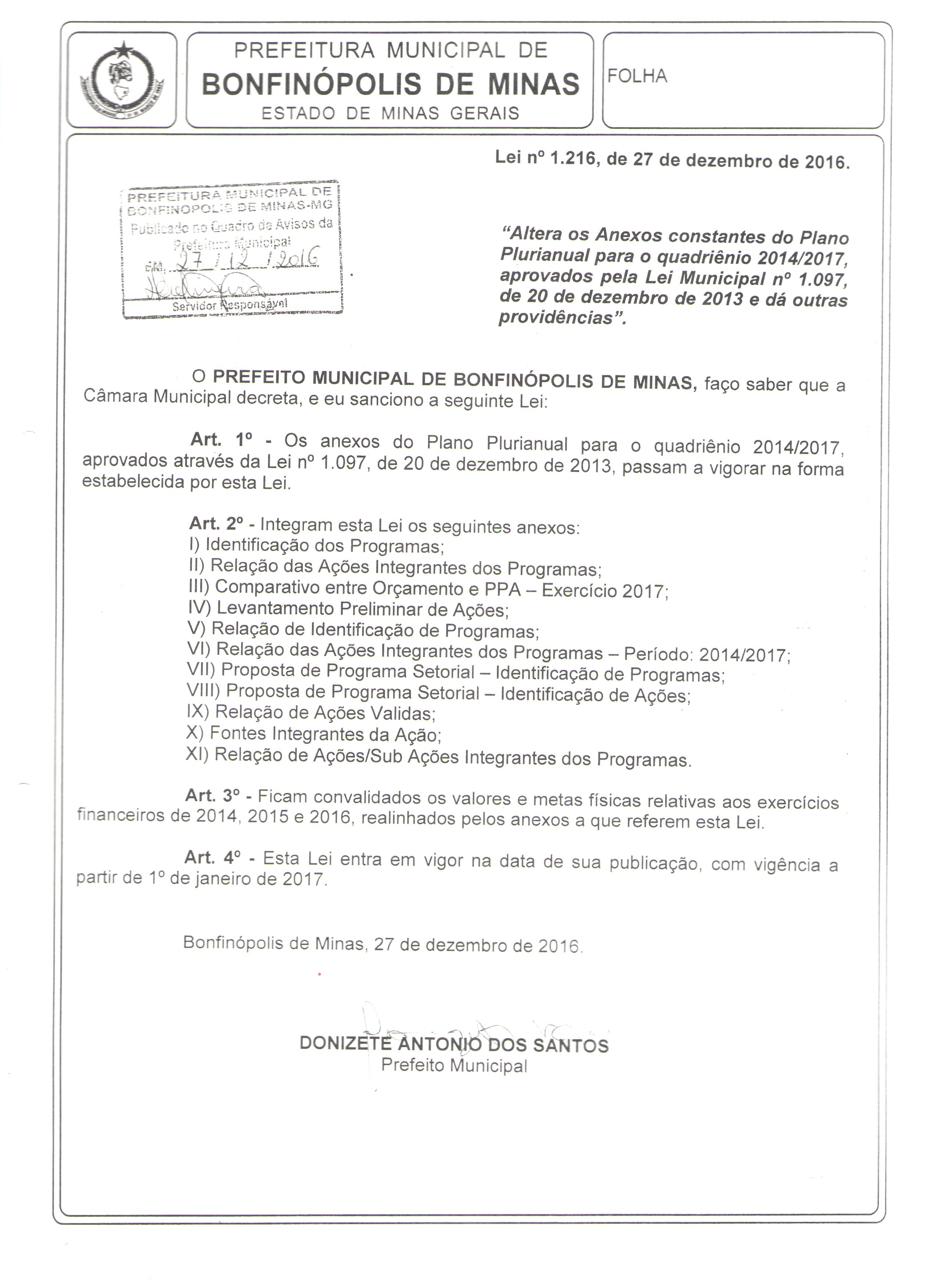 Lei nº 1.216, de 27 de dezembro de 2016