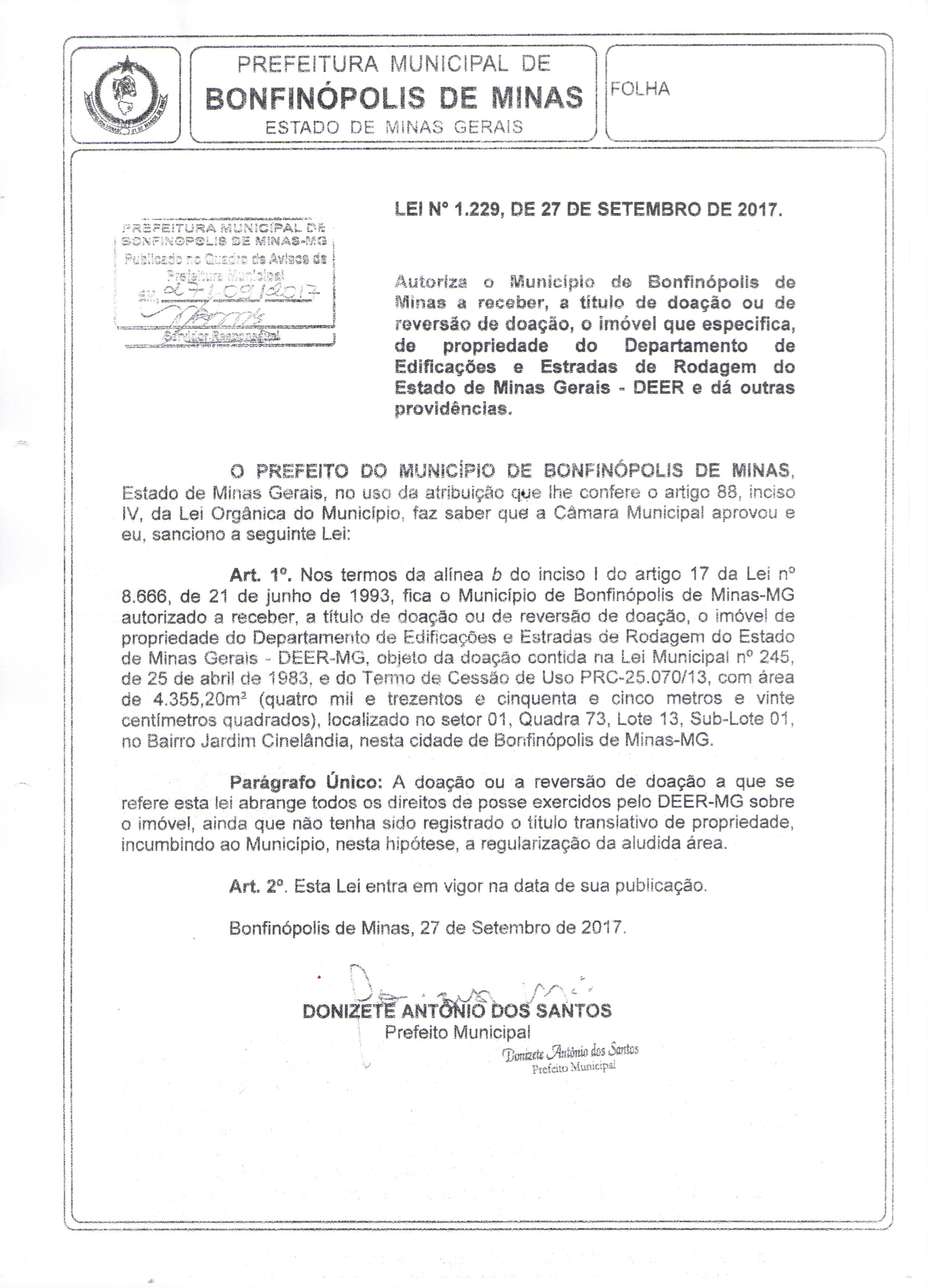 AUTORIZA O MUNICÍPIO DE BONFINÓPOLIS DE MINAS A RECEBER, A TÍTULO DE DOAÇÃO OU DE REVERSÃO DE DOAÇÃO, O IMÓVEL QUE ESPECIFICA, DE PROPRIEDADE DO DEPARTAMENTO DE EDIFICAÇÕES E ESTRADAS DE RODAGEM DO ESTADO DE MINAS GERAIS - DEER E DÁ OUTRAS PROVIDÊNCIAS.